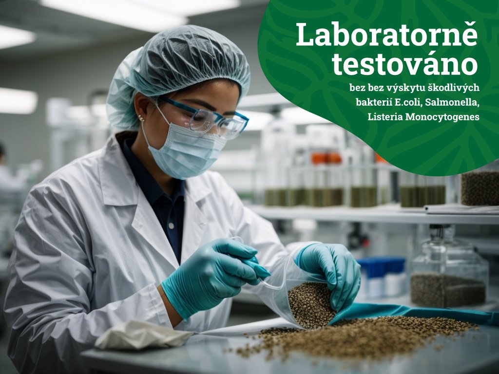 - Laboratorně testováno – Semínka neobsahují stopy škodlivých bakterií E.coli, Salmonella ani Listeria Monocytogenes. Testujeme každou šarži úrody.