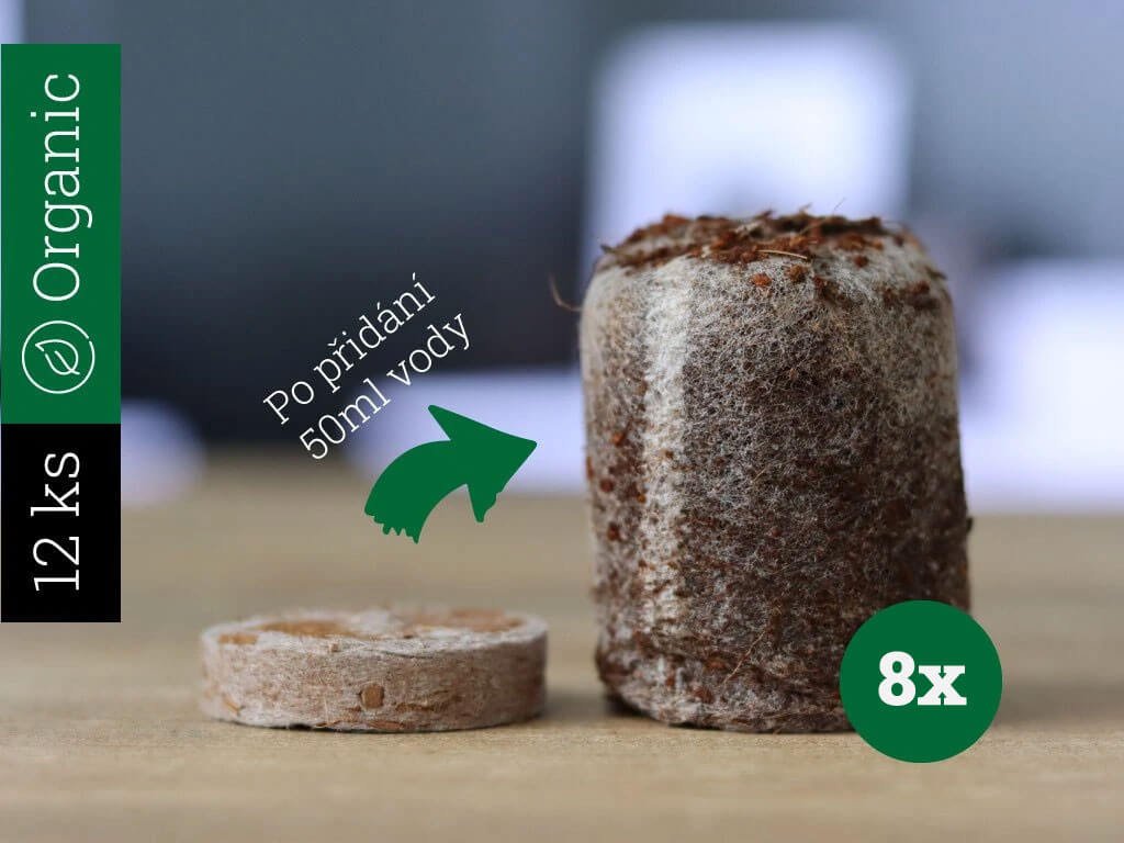 Kvalitní organická zemina ve formě 100% kokosového substrátu lisovaného do 8 dehydratovaných tablet, S obsahem přírodní trichodermy (mycelium podporující vstřebávání vody do kořenů), Bez rašeliny, Bez plastu
